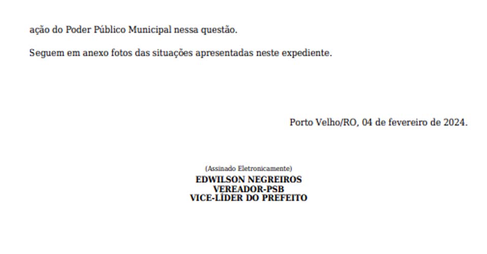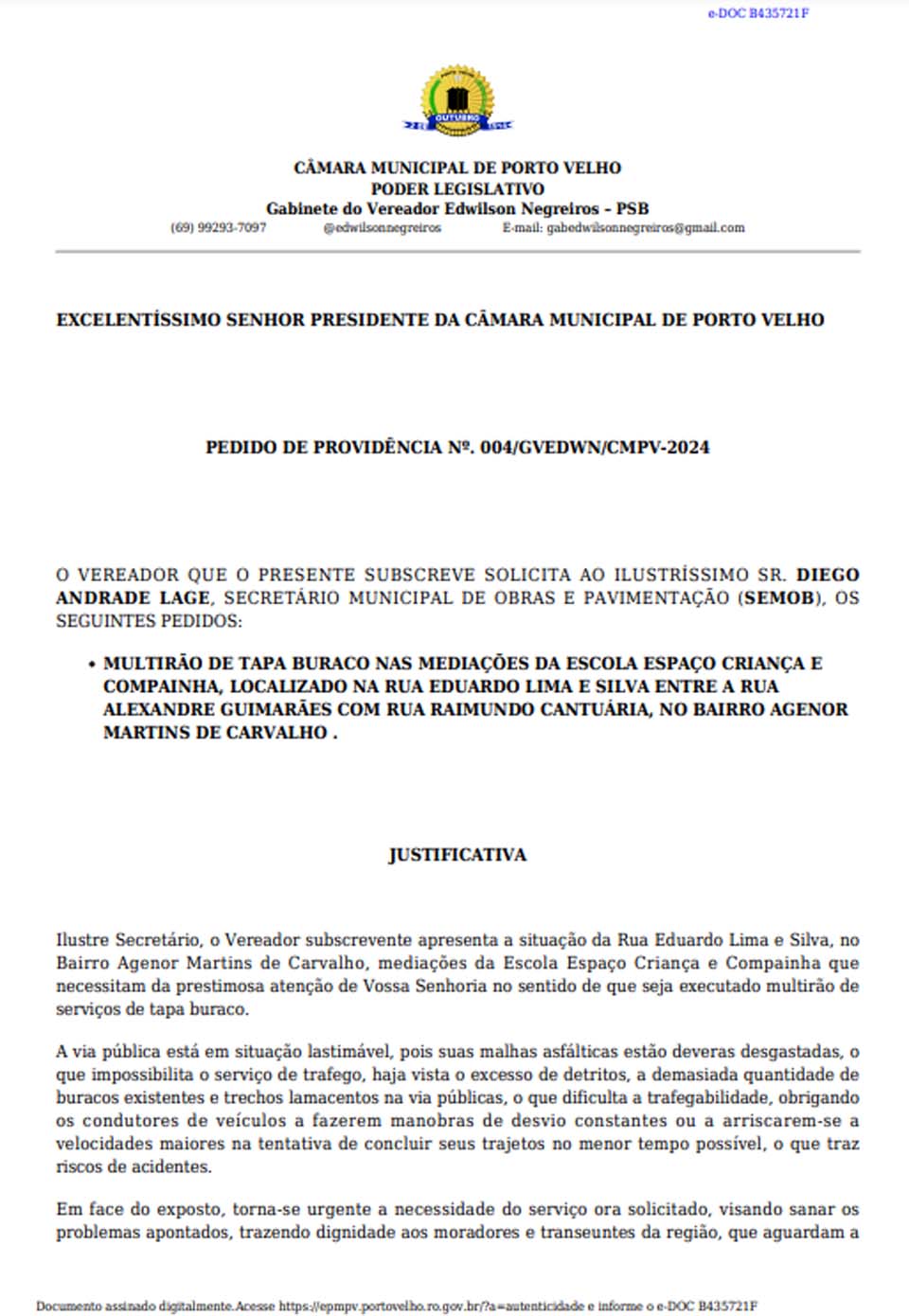 Porto Velho, RO – O vereador Edwilson Negreiros, do PSB, encaminhou ao Secretário Municipal de Obras e Pavimentação (SEMOB) um pedido de providência para a realização de um mutirão de tapa-buracos nas mediações da Escola Espaço Criança e Compainha, localizada na Rua Eduardo Lima e Silva entre as ruas Alexandre Guimarães e Raimundo Cantuária, no Bairro Agenor Martins de Carvalho.