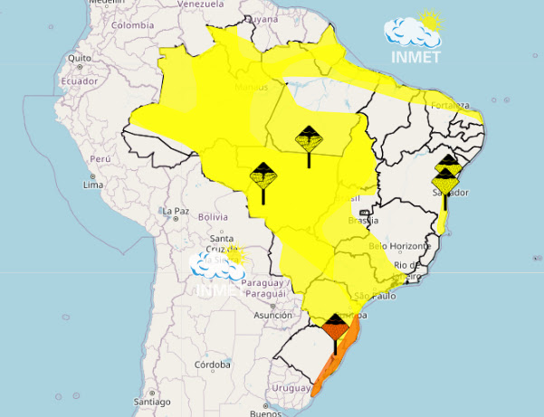 O Inmet emitiu um alerta laranja, que indica um nível de “perigo”, para o litoral do Rio Grande do Sul e Santa Catarina. Nessas áreas, espera-se um acumulado de chuva que pode variar entre 30 a 60 mm/h ou 50 a 100 mm/dia. Este volume de chuva aumenta o risco de alagamentos, deslizamentos de terra e transbordamentos de rios. Além disso, quatro alertas amarelos, de “perigo potencial”, foram emitidos para outras regiões, prevendo chuvas de menor intensidade e ventos que podem alcançar 60 km/h.